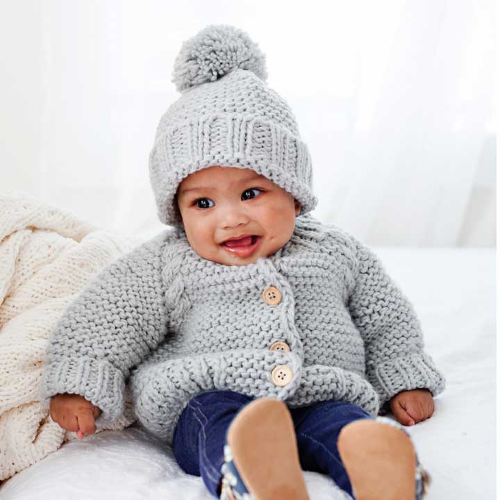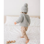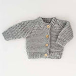 This snuggly, hand-knit cardigan features a thick garter stitch with adorable cable-trimmed raglan sleeves and charming wooden buttons. Made from soft, light grey yarn, it’s perfect for keeping little ones warm and comfy. Don’t miss the matching knit hat, sold separately—a delightful gift for any tiny bundle of joy! Our sweaters are partially knit from recycled, sustainable Polyester yarn made from plastic bottles. We are on a mission to help reduce the world's plastic pollution problem ♻