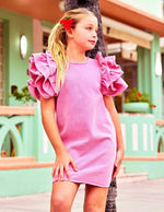 - Adorable pink denim dress featuring dramatic ruffle sleeves, perfect for adding a touch of princess charm to any outfit.