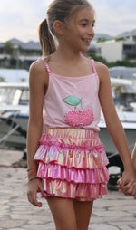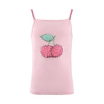 • Sweeten up your style with this charming pink tank, featuring a vibrant cherry design adorned with sparkling gems.