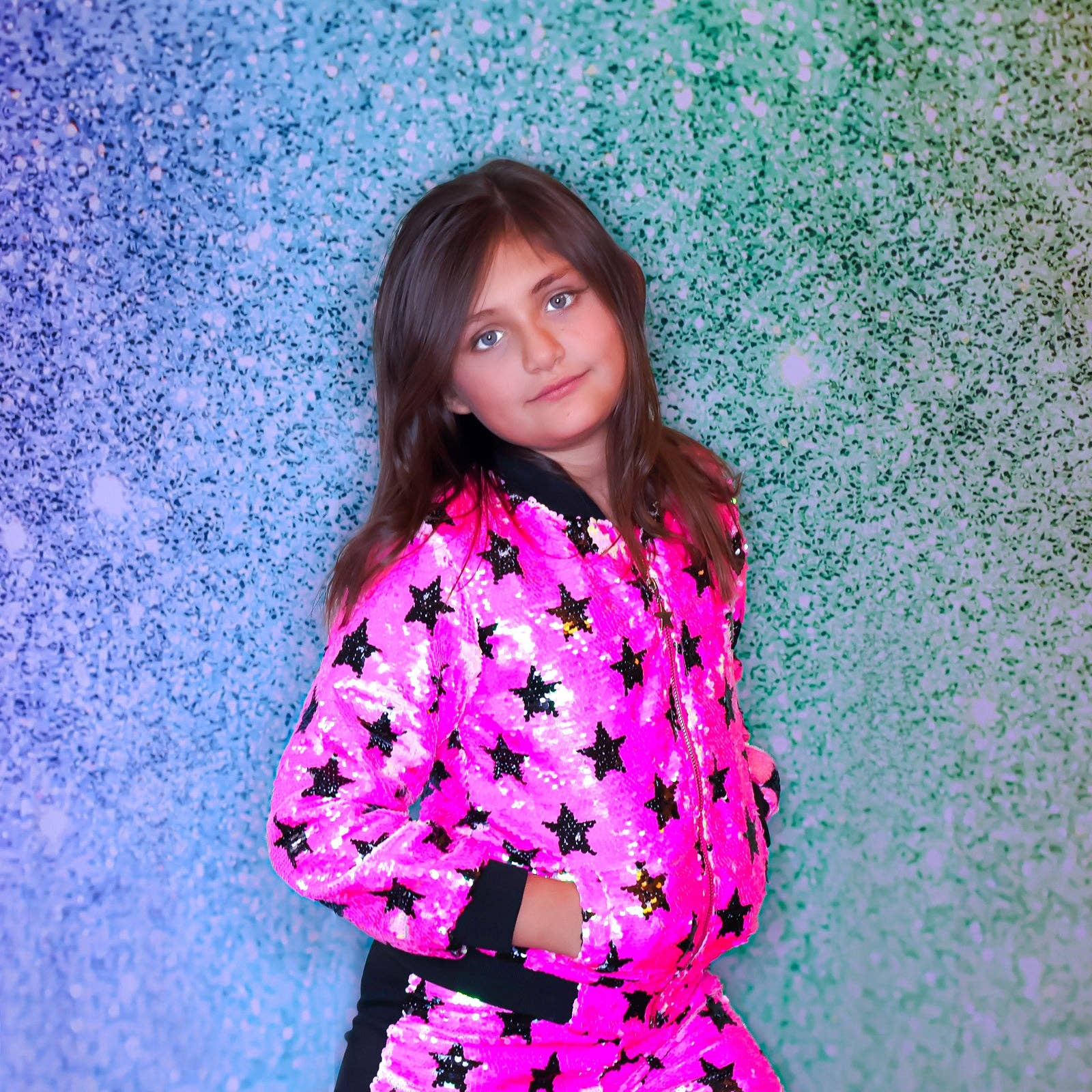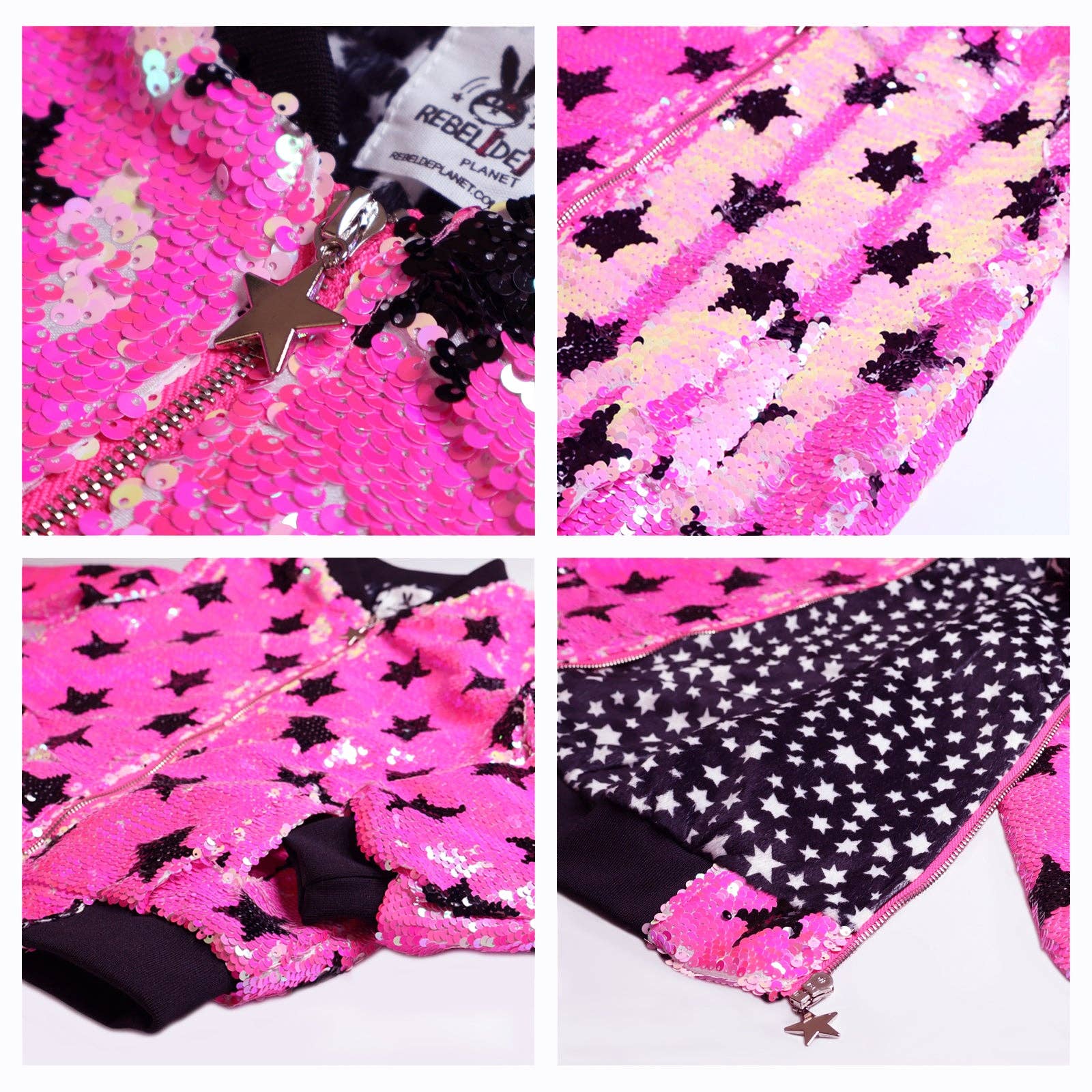 🌟 Flip It, Sparkle It, Rock It! The Ultimate Sequin Bomber Jacket is Here! πŸ’–πŸ–€ Get ready to shine like a superstar in our bold and magical Flip Sequin Bomber Jacket! Covered in hot pink sparkles and black stars that flip with a swipe, this jacket is like a game and a fashion statement all in one. ✨✨ Give it a swoosh andβ€”boom!β€”watch the sequins change like magic! Whether you're striking a pose, spinning in circles, or heading out on your next big adventure, this jacket is your sparkly sidekick. πŸ’« Snuggly soft inside with fleece lining, cozy side pockets (perfect for treasures or chilly hands!), and a shiny silver zipper that glides like butter. Stretchy ribbed trim at the collar, cuffs, and bottom keeps everything comfy and in placeβ€”so you can dance, jump, and twirl with ease! Why it’s totally awesome: 🌟 Flip sequins for sparkly fun you can feel! πŸ–€ Hot pink + bold black stars = total rockstar energy πŸ§₯ Super cozy fleece lining to keep you warm ✨ Smooth silver zipper = easy peas