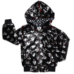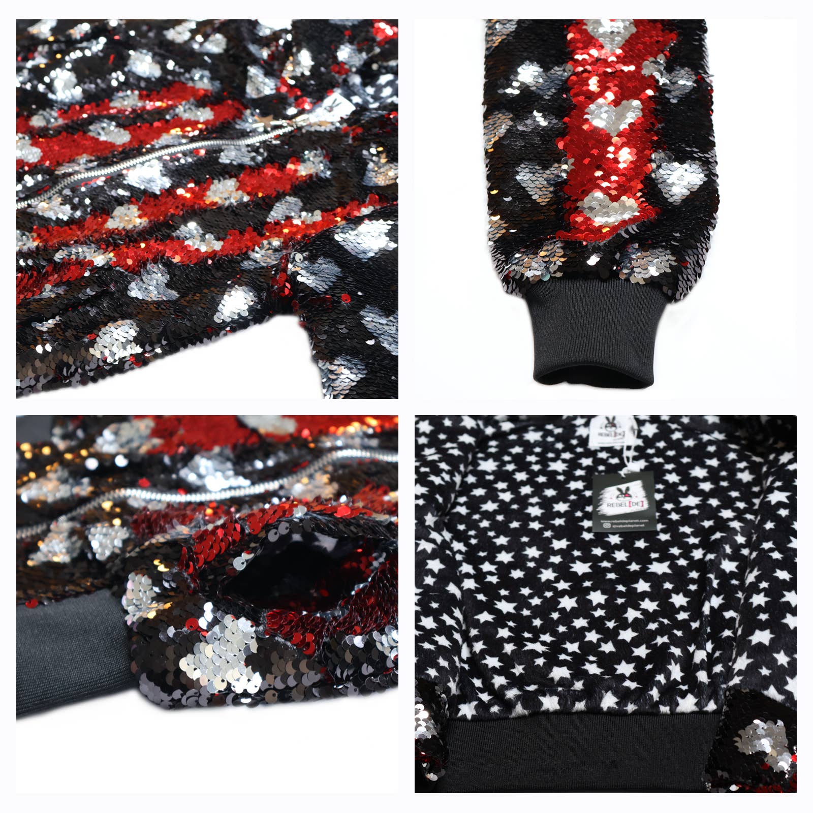 Turn heads and light up any room with this dazzling hooded bomber jacket! Covered in bold black flip sequins that reveal a striking red background with sparkling silver hearts, it's all about fun, flair, and personality.