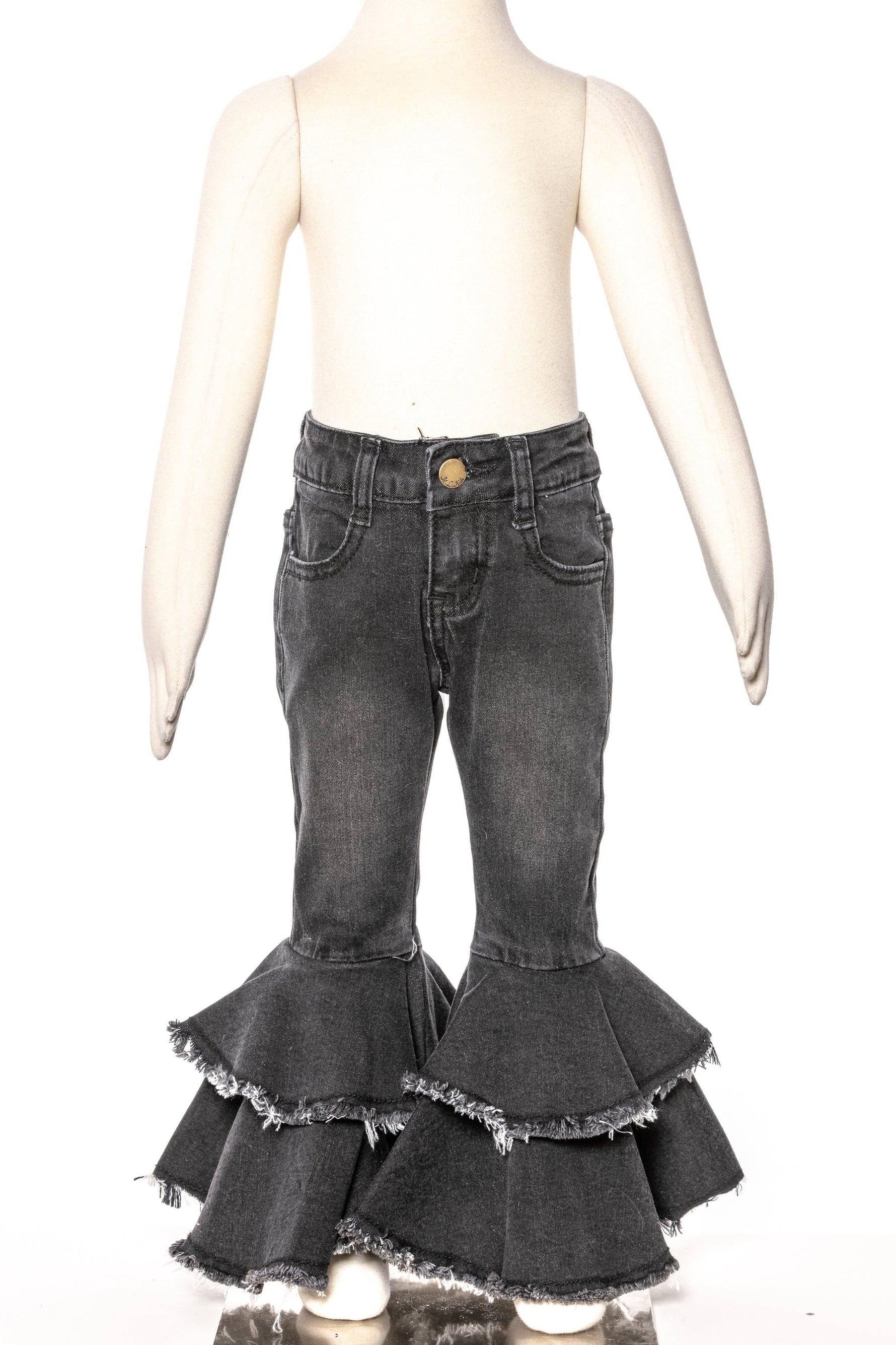 Elevate your child's wardrobe…fashionable denim jeans featuring tiered double ruffle bell bottoms for a trendy look. These stylish pants also have a hidden waist adjuster for a comfortable fit.
