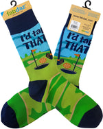 Funny men's novelty crew socks "I'd Tap That." Great gift for a man who loves golf. Stylish and comfortable! Fits men's shoe size 7 to 12. 80% Cotton, 15% Nylon, 5% Spandex. Easy Care - Machine wash