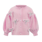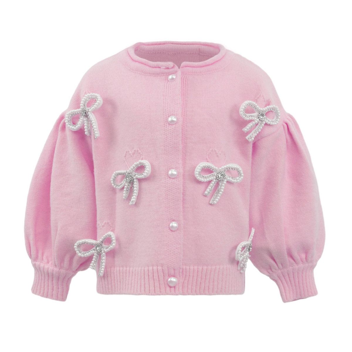 • Soft pink cardigan embellished with delicate pearl bow appliqués for a charming and feminine look.
