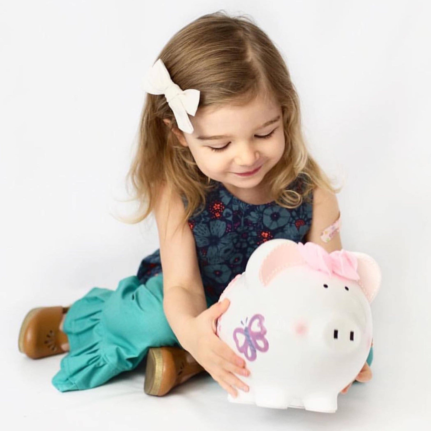This charming Handpainted Butterfly Piggy Bank is designed to be both a delightful décor piece and a practical keepsake for families and kids. Featuring a classic pig shape with a pristine white ceramic base, it is adorned with handpainted pastel butterflies and flowers, enhanced with delicate glitter on the butterfly wings. The pig’s ears are accented with pink and white dotted patterns, complemented by rosy cheeks and a soft pink bow on top for a whimsical touch.